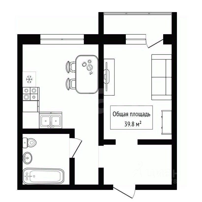 В квартире выделена детская комната, гостиная с окном и просторная кухня площадью 12 кв.м.