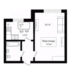 Квартира имеет четкое зонирование: жилая площадь 16.7 кв.м., отдельная кухня 5.2 кв.м., и совместный санузел.
