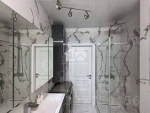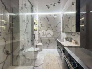 • Санузел с душевой в стильном мраморном исполнении.