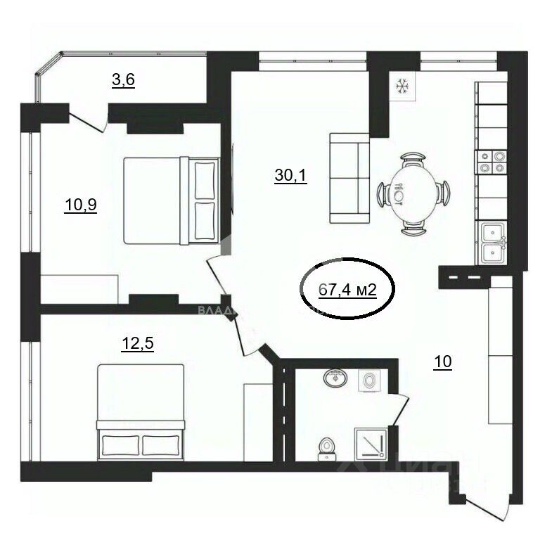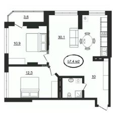 Функциональная и просторная планировка 2+1 (две комнаты + большая кухня-гостиная).