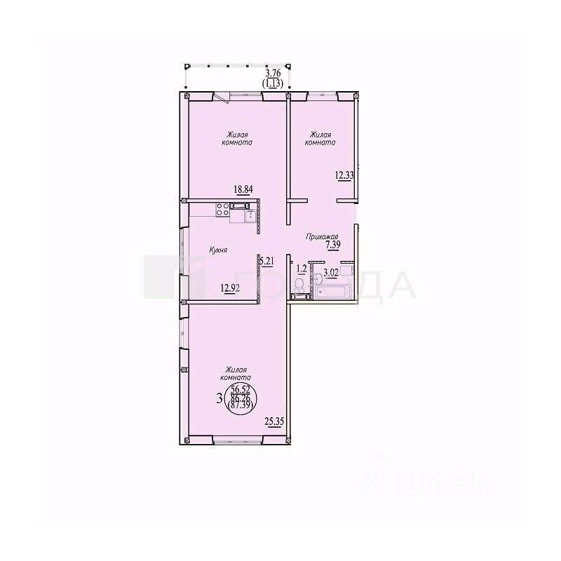 Квартира расположена на втором этаже десятиэтажного кирпично-монолитного дома, построенного в 2020 году. Общая площадь — 86,8 квадратных метров, из которых 56,5 квадратных метров приходится на жилую площадь. Просторная кухня площадью 12,9 квадратных метров станет любимым местом для семейных ужинов.