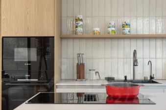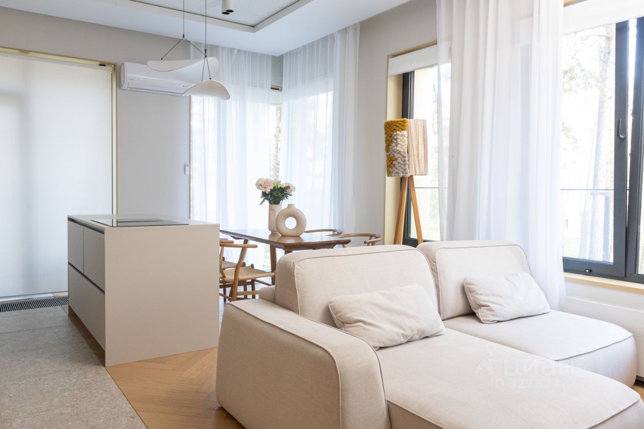 Сердце квартиры — просторная кухня-гостиная, наполненная светом за счёт углового остекления и выхода на большой, глубокий балкон нестандартной формы. Таких балконов в доме всего два. Он объединяет кухню-гостиную и мастер-спальню, формируя единое пространство, которым действительно пользуются. В тёплое время года здесь можно обустроить зону отдыха или небольшой сад, проводить вечера с чаем, наслаждаясь свежим воздухом и пением птиц соснового бора.