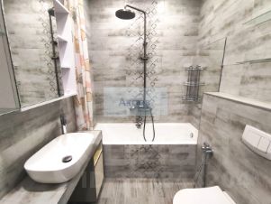 Новому собственнику остается: два кондиционера, видеодомофон, кухонный гарнитур со встроенной бытовой техникой (измельчитель в раковине, варочная панель, вытяжка, духовой шкаф, микроволновая печь, посудомоечная машина), пуфик и два встроенных шкафа в прихожей, встроенный шкаф в комнате, полки и шкаф в ванной комнате.