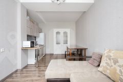 Новому покупателю остаётся кухонный гарнитур, электрическая плита, холодильник, стиральная машина, водонагреватель, диван в кухне-гостиной, встроенный шкаф, диван в комнате, шкаф в прихожей.