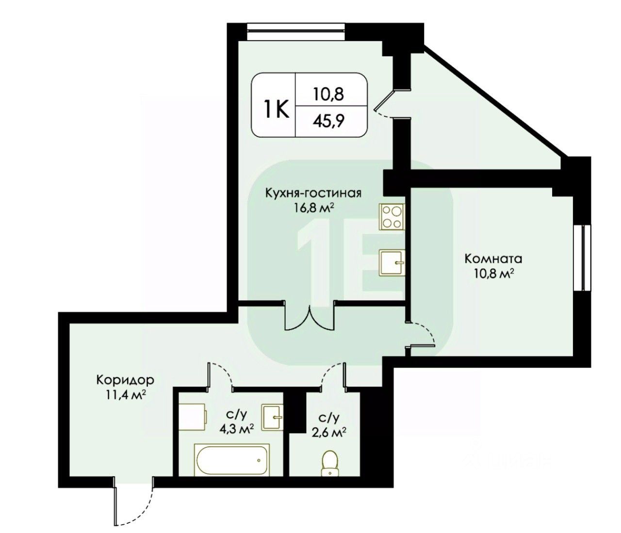 Удобная планировка с просторной кухней-гостиной.
