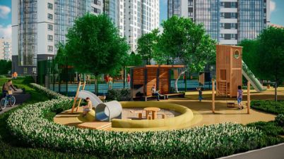 Дворы - просторная парковая зона площадью около тысячи квадратных метров. На территории внутреннего двора-парка нет автомобильных проездов, тщательно продуман ландшафтный дизайн с природными холмами, множеством зелёных насаждений и цветников. Большая многофункциональная детская площадка.