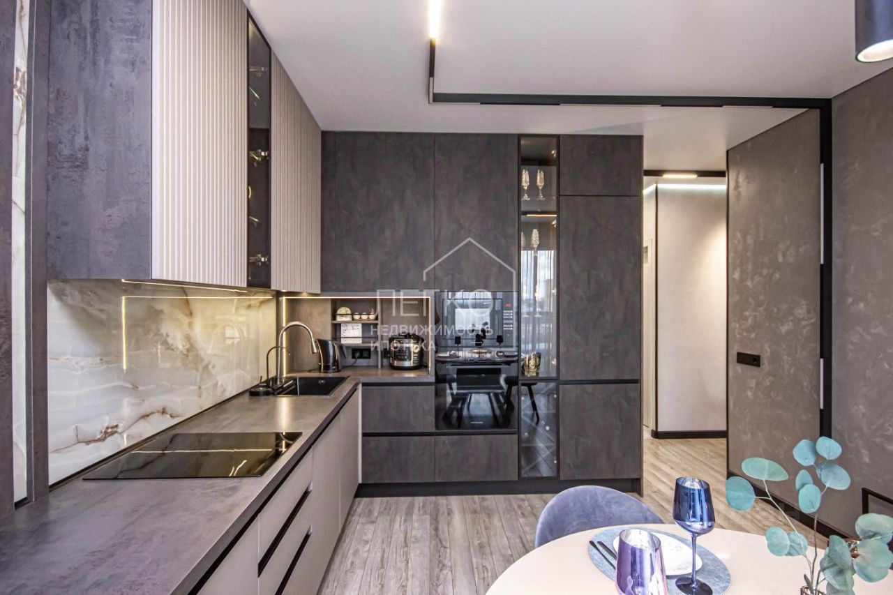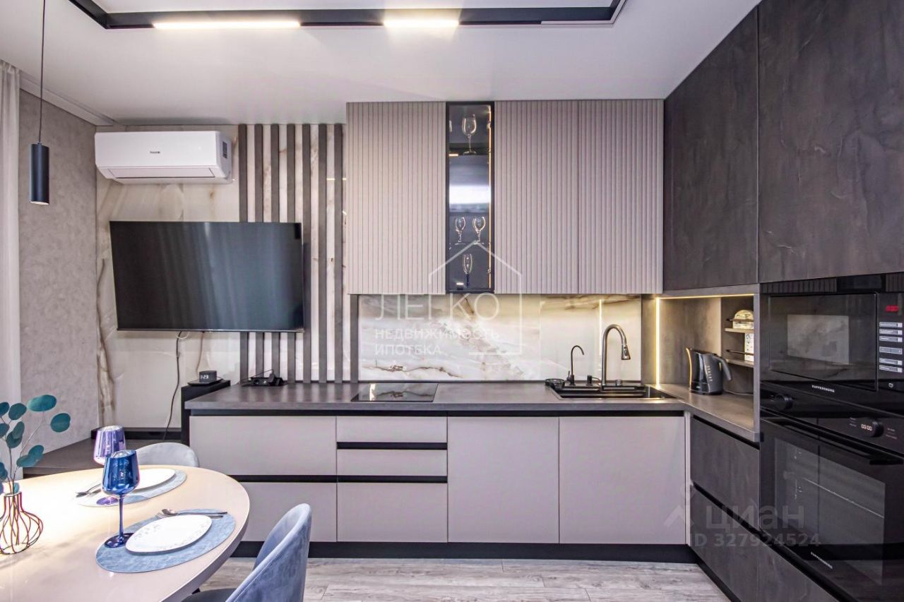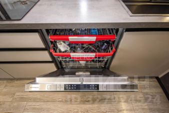 кухня-гостиная: встроенная кухня с доводчиками, подсветкой изготовлена под индивидуальный заказ в компании Cucina, шкафы МДФ с современным пластиковым покрытием и фрезеровкой. Фартук керамогранит! Имеется сушильная зона для посуды, бар, красивые стеклянные шкафы с вертикальной подсветкой для бокалов! Мойка с дозатором для мыла, чистой водой( установлены фильтры), функциональным краном. Также имеется приспособление для мытья овощей и фруктов.