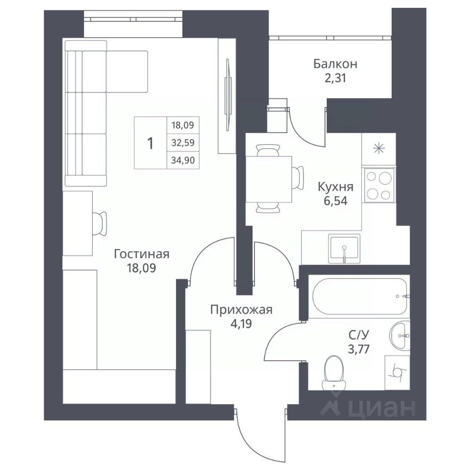 Продается 1-комн. квартира с предчистовой отделкой. Квартира расположена на 2 этаже 24 этажного монолитно-кирпичного дома в Акцентном доме "Актив" от группы компаний "Поляков".