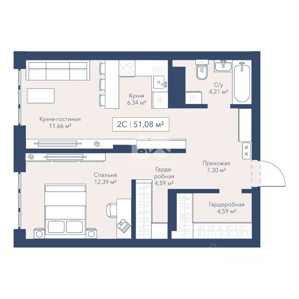 Общая площадь квартиры составляет 51,08 кв. м, из которых 24,05 кв. м — жилая площадь, а 6,34 кв. м — кухня. Высота потолков — 2,7 м, комнаты изолированы, окна выходят на улицу, две гардеробных 9,18 кв. м.
