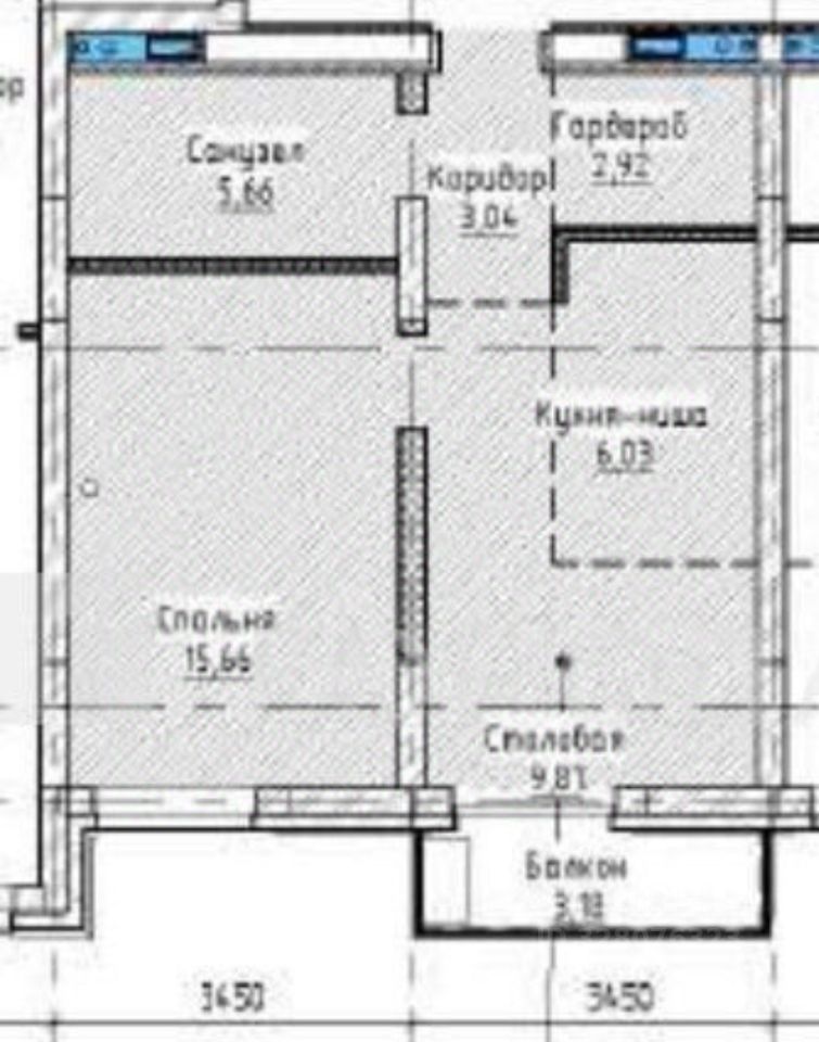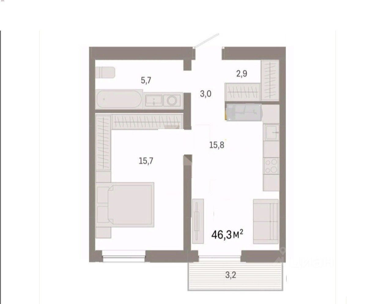 Однокомнатная квартира площадью 43,2 кв.м.,плюс балкон 3,2кв.м.