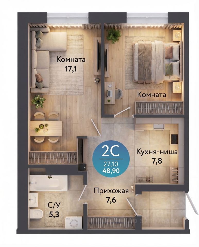 Стены выровнены, а ровная стяжка на полу позволяет выбрать любое напольное покрытие, которое вам нравится.