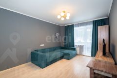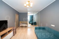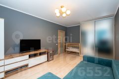 • Стены в жилой комнате оформлены в спокойных нейтральнх оттенках, на полу ламинат.