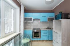 • Кухонный гарнитур в светлых и голубых тонах, встроенная панель и духовой шкаф, фартук из плитки. Площадь позволяет размести обеденный стол и дополнительную мебель.