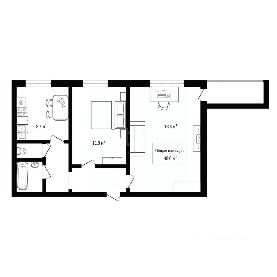 Общая площадь — 48 м², кухня — 8,7 м²