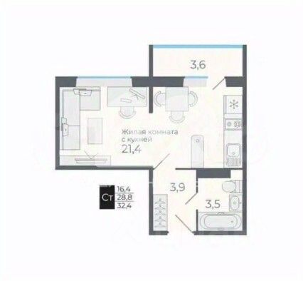 Функциональная, с удобным совмещённым санузлом.
