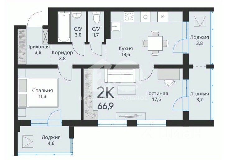 Общая площадь составляет 66,9 кв. м, комнаты изолированы, а окна выходят на улицу.