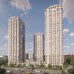 Комплекс представляет замкнутую постройку из трех башен. Две башни 30 этажей и одна 25-этажная расположены в шахматном порядке, что позволяет создать парадную симметрию и в то же время разреженную, "проницаемую" структуру застройки всего комплекса. При этом башни расставлены с оптимальными паузами, чтобы каждому метру доставалось максимум солнца. Архитектурно-художественный образ выполнен в стиле модернизма в современном прочтении. В отделке фасадов использован облицовочный кирпич белого цвета разных тонов. Комплекс строится по технологии монолитный каркас с кирпичным заполнением, облицовка декоративным керамическим белым кирпичом. А кладка наружной версты уступами, наличие ниш, поясов и эркеров добавляет фасадам пластики. В то же время комплекс зданий смотрится цельным и единым благодаря общей фактуре.