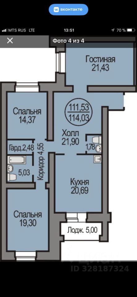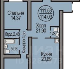 Общая площадь квартиры составляет 111.9кв. м жилая площадь — 55.1 кв. м, площадь кухни — 20.69 кв. м и просторная лоджия 5 кв. м. Квартира находится на комфортном 5 этаже. Высота потолков — 2.7 метра, что добавляет ощущение простора.