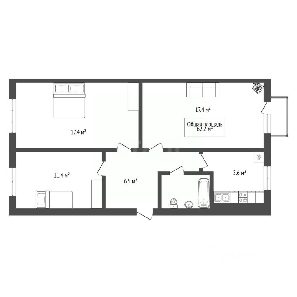 Предлагается к покупке просторная трехкомнатная квартира площадью 62,2 кв. м, на 3 этаже 5-этажного дома.