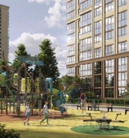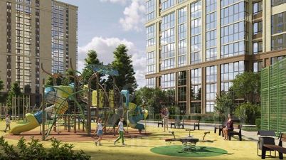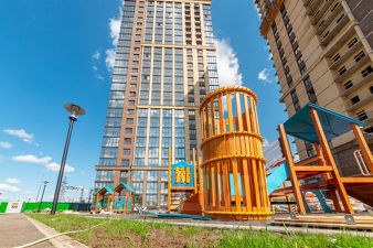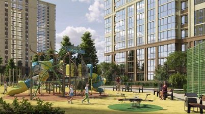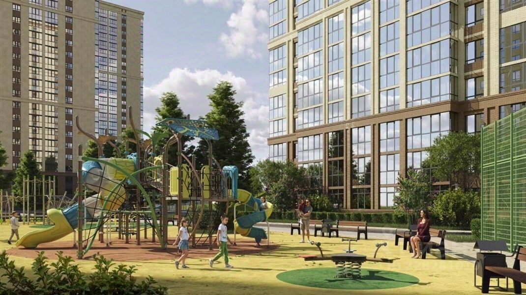 Двор комплекса - это заливистый смех детей, оживленные разговоры взрослых, тихое щебетание птиц и шуршание зеленых веток. Кто-то выходит с покупками из магазина, пока другие сидят на завтраке в кофейне. В это время в роще родители гуляют с колясками и вокруг них по деревьям прыгают белочки. На футбольном поле занимаются подростки, а ребята помладше бегают от качелей к горкам по безопасному покрытию игровой площадки.