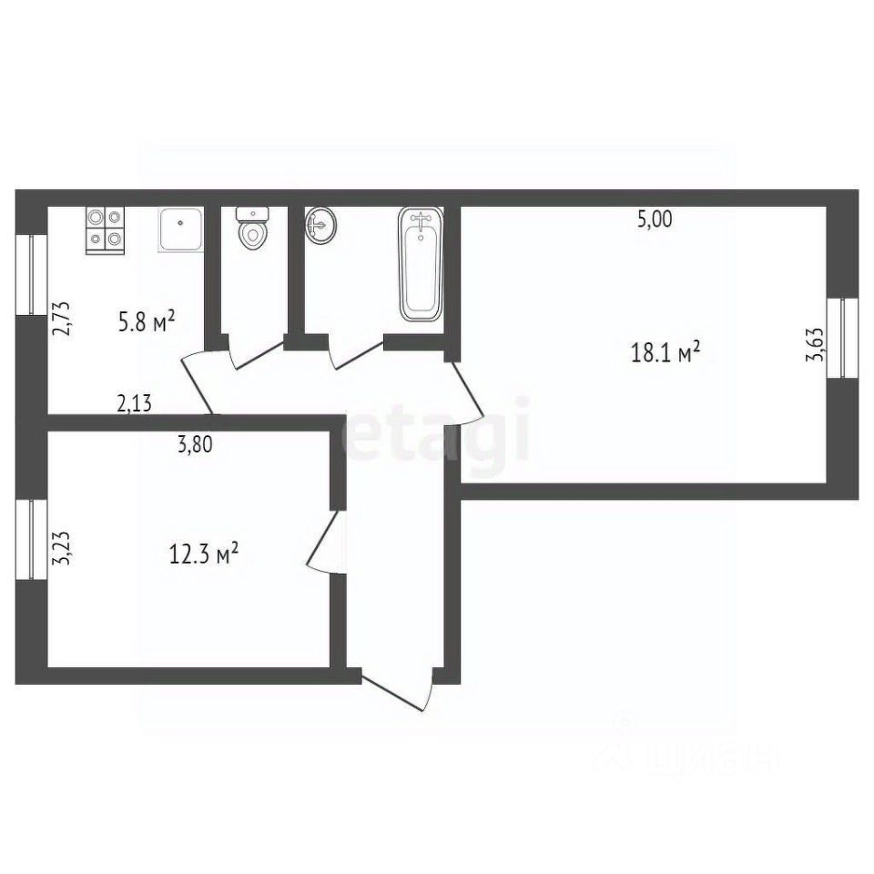 2К квартира в Центральном микрорайоне Искитима расположена на втором этаже 2-х этажного дома. Планировка продумана: изолированные комнаты (14 и 12 кв. м) позволяют комфортно разместить семью или использовать одну из них как кабинет, а просторная кухня-гостиная (9 кв. м) объединяет зону приготовления пищи и отдыха.