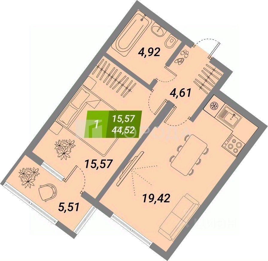 Общая площадь квартиры составляет 44,6 кв. м, из них 15,6 кв. м — жилая площадь, 19 кв. м — кухня. Высота потолков — 2,8 м, что создаёт ощущение простора. В квартире есть лоджия, где можно обустроить уютное место для отдыха. Планировка продуманная и функциональная, комнаты изолированы, что обеспечивает комфорт и уединение.