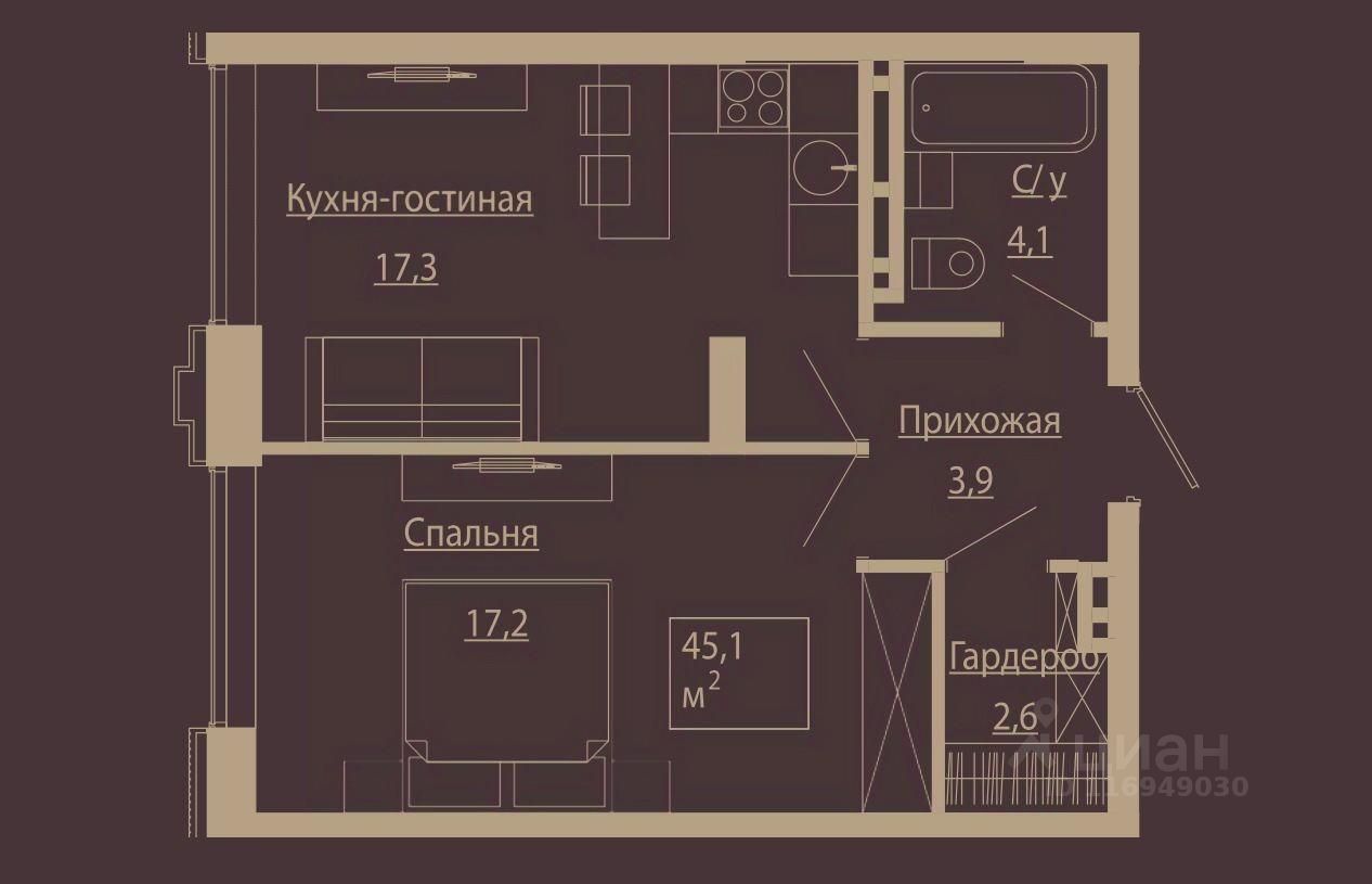 Общая площадь45,1 м²