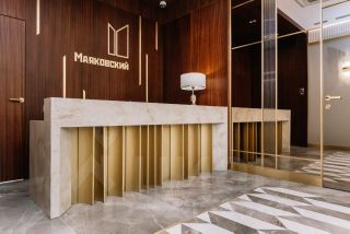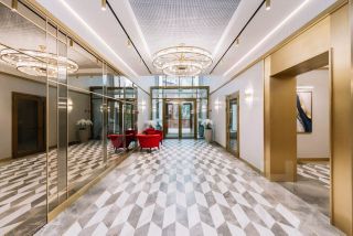 Изысканная отделка интерьеров лобби и холлов жилых этажей выполнена в стиле ар-деко. Лобби украшает дизайнерская мебель, мрамор и натуральное дерево. Общественные зоны украсили зеркала, светильники, молдинги и акцентные элементы из латуни. Настенные панели и входные двери выполнены из шпонированной древесины ценных тропических пород.