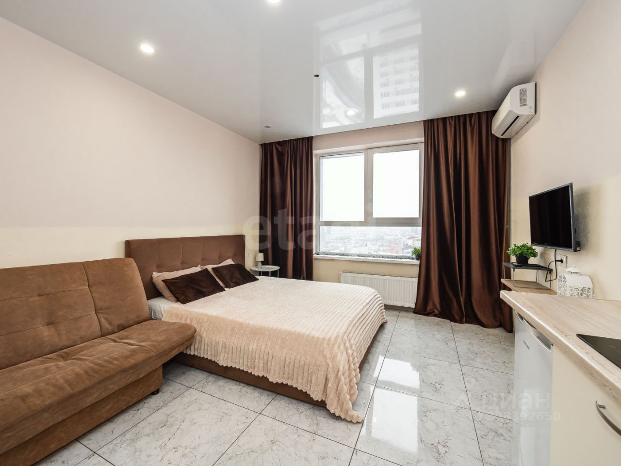 В продаже уютные апартаменты-студия с впечатляющим панорамным видом на город, расположенные в современном апарт-комплексе.
