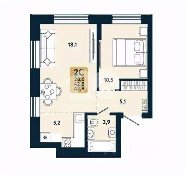 Продаётся евро-2-комнатная квартира, 42,6 м², предчистовая отделка.