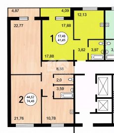 Общая площадь квартиры составляет 70,2 кв. м, жилая — 44 кв. м, площадь кухни — 11 кв. м. Есть один совмещённый санузел.