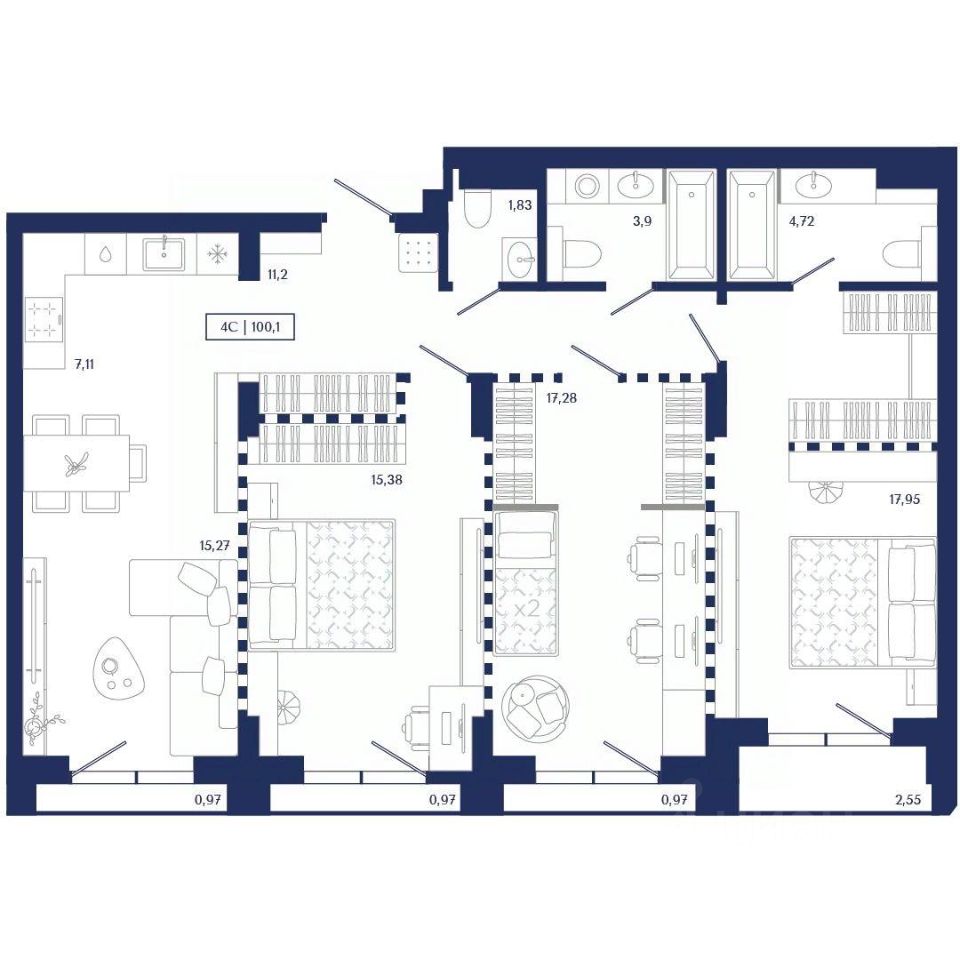Продаётся 4-комнатная квартира в строящемся доме (Секция 1.1), срок сдачи: IV-кв. 2026, общей площадью 100.1 кв.м., на 8 этаже. Unity Center — квартал бизнес-класса в "золотом" центре Новосибирска.