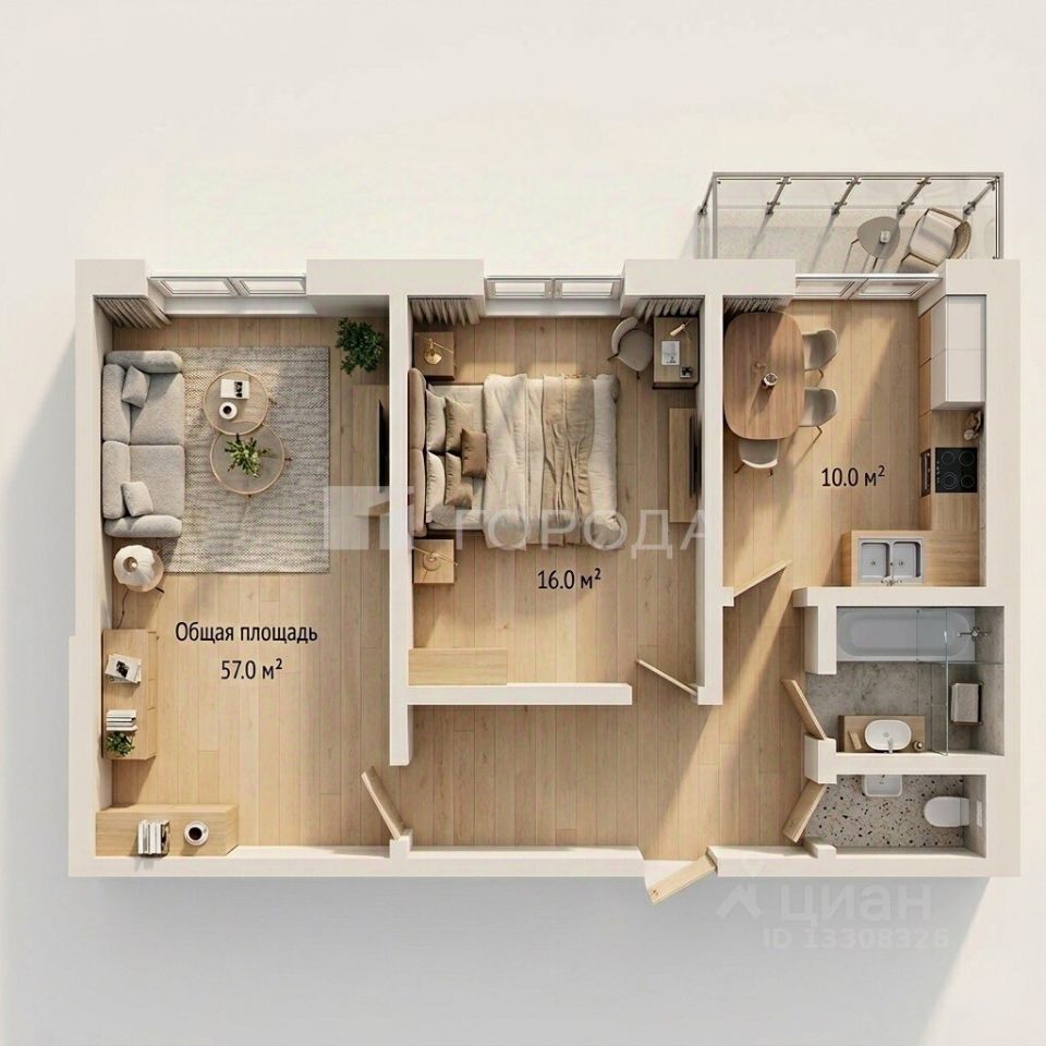 Общая площадь: 57 м²