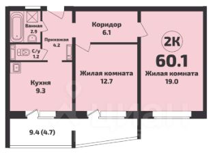 9,4 кв. м. и раздельным санузлом. Комната 19 кв.м. комната 12,7 кв. м. с выходом на лоджию, кухня 9,3 кв. м. с выходом на лоджию, прихожая 4,2 кв. м, коридор 6,1 кв. м. Окна выходят во двор, на большую детскую площадку. В доме подъезды на две стороны, один - на большую парковку, другой - во двор на детскую площадку.