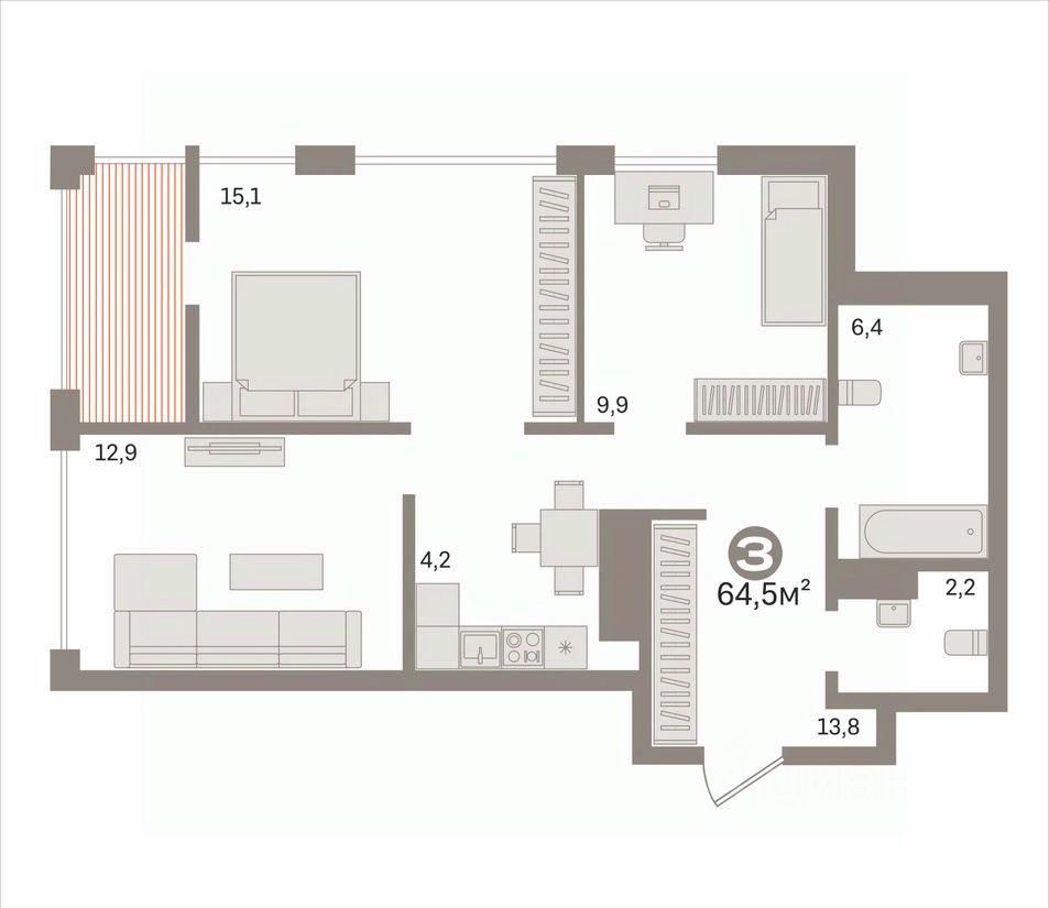 Трехкомнатная квартира площадью 64,5 кв.м.