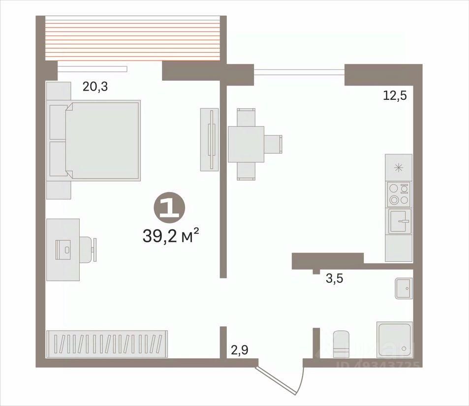 Однокомнатная квартира площадью 39,2 кв.м.