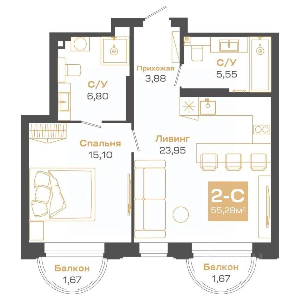 Общая площадь55,28 м²