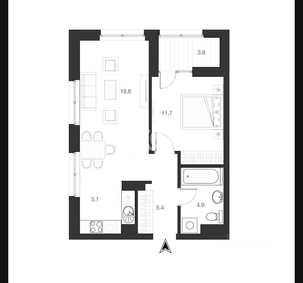 Квартира с возможностью обустройства дополнительной изолированной комнаты и личной террасы, площадью - равной квартире.