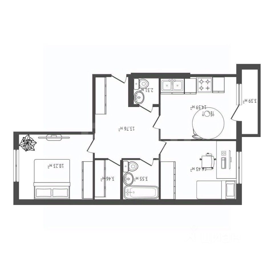 — Удобная современная планировка: большая кухня-гостиная + отдельные комнаты, раздельный санузел.