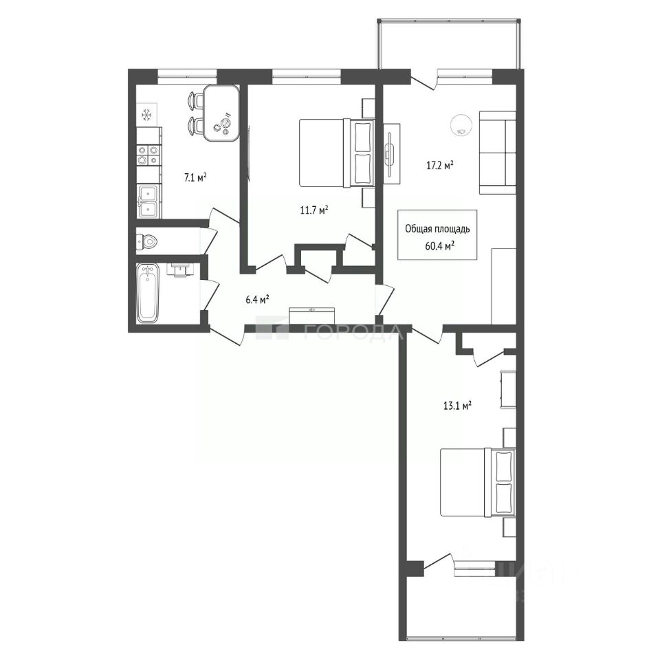 Окна выходят на две стороны, что благоприятно для проветривания квартиры, особенно в летнее время.