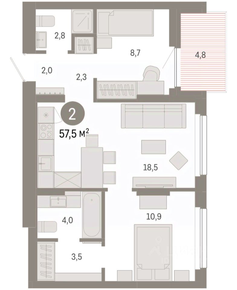 Просторная двухкомнатная квартира с предчистовой отделкой в ЖК "Лебедевский" на 6 этаже. Общая площадь: 57.5 кв.м., жилая: 19.6 кв.м., площадь просторной кухни-гостиной: 18.5 кв.м. Комнаты изолированные, все окна выходят на одну сторону. В квартире одна лоджия, два совмещенных санузла. Высота потолков 2.82 м.