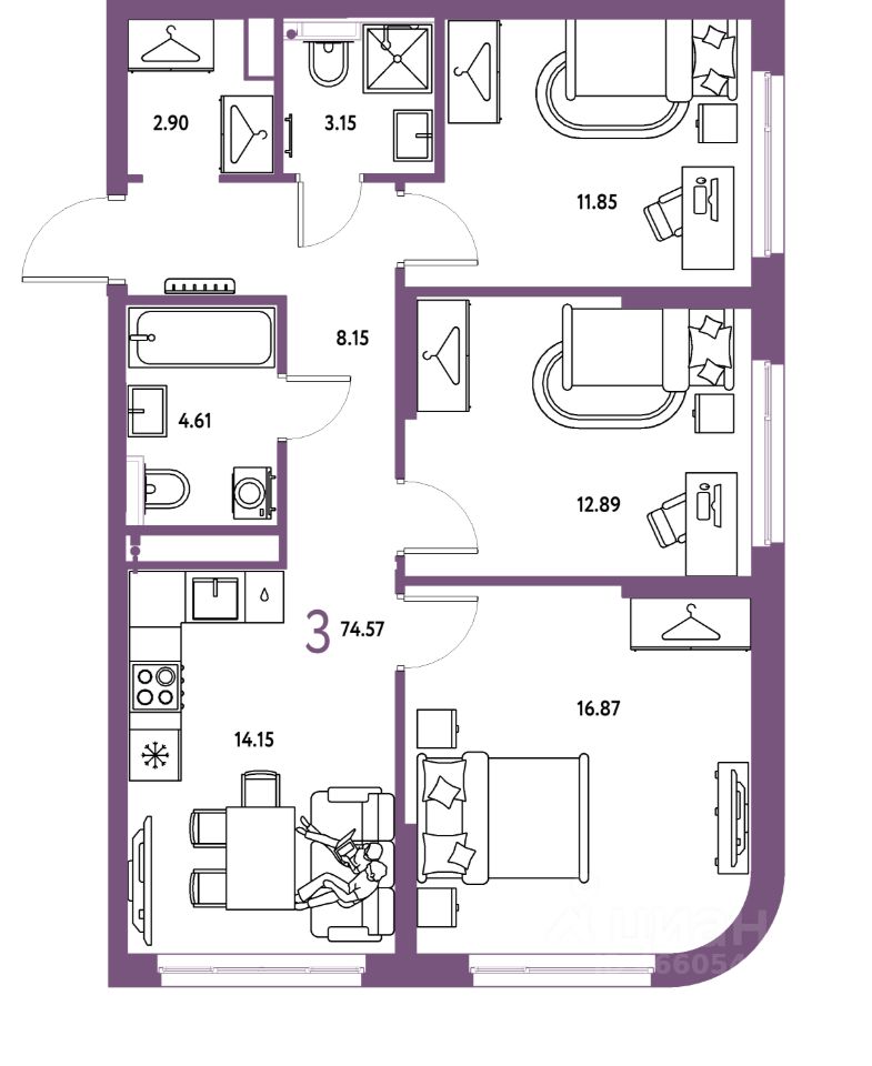 Продаётся 3-комнатная квартира в строящемся доме (Дом 2), срок сдачи: IV-кв. 2027, общей площадью 74.57 кв.м., на 9 этаже. "Страна. Тополёвая" - органично вписанный в городскую среду дом-квартал переменной этажности с акцентной башней доминантой. Мы открываем новую главу истории города, создавая пространство, в котором комфортно жить, работать и строить счастливое будущее.
