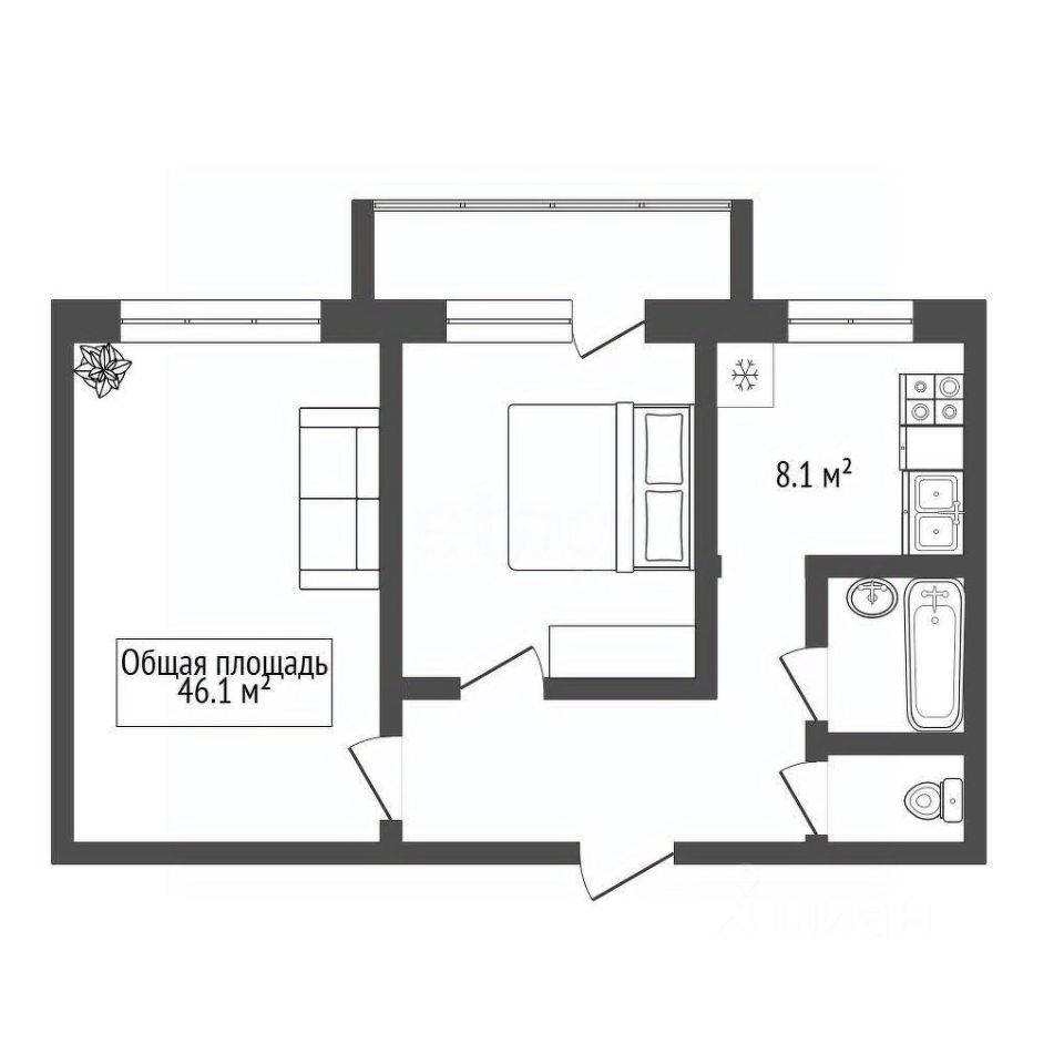• Жилая площадь составляет 46,1 квадратных метров