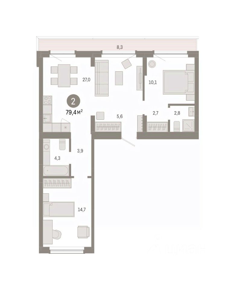 Квартира с кухней-гостиной и двумя спальнями в квартале "Лебедевский". Особенности планировки: мастер-спальня, окна на две стороны, предчистовая отделка, разнесённые спальни, терраса на крыше.