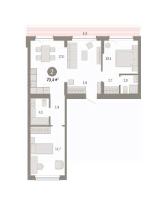Двухкомнатная квартира с предчистовой отделкой в ЖК "Лебедевский" на 8 этаже. Общая площадь: 79.4 кв.м. Высота потолков 2.82 м.