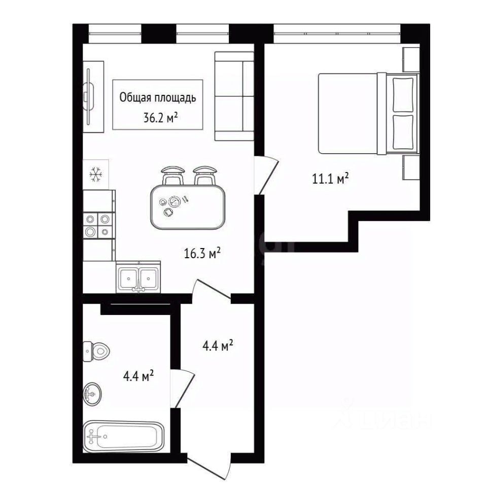 • Квартира поделена на кухню-гостиную и спальню. Перегородка между