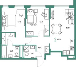 Продаётся 2-комнатная квартира в строящемся доме (Дом 2), срок сдачи: IV-кв. 2027, общей площадью 66.96 кв.м., на 6 этаже. "Страна. Тополёвая" - органично вписанный в городскую среду дом-квартал переменной этажности с акцентной башней доминантой. Мы открываем новую главу истории города, создавая пространство, в котором комфортно жить, работать и строить счастливое будущее.