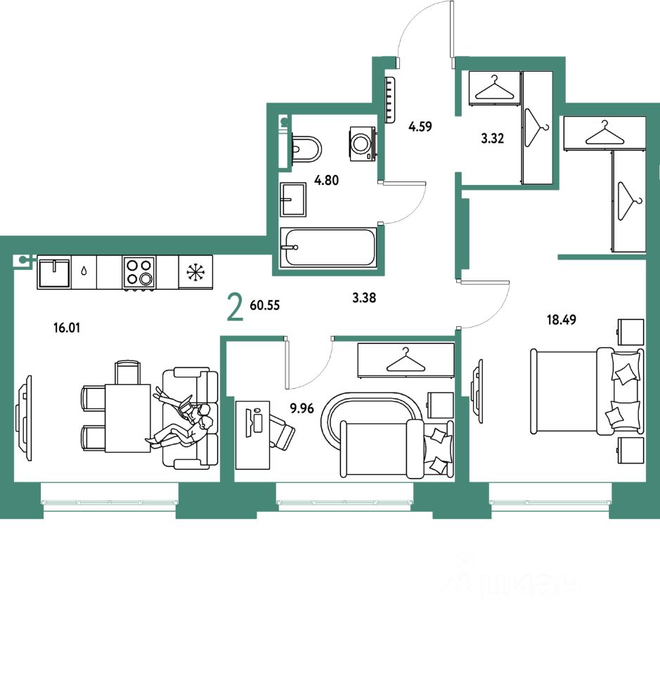 Продаётся 2-комнатная квартира в строящемся доме (Дом 2), срок сдачи: IV-кв. 2027, общей площадью 60.55 кв.м., на 2 этаже. "Страна. Тополёвая" - органично вписанный в городскую среду дом-квартал переменной этажности с акцентной башней доминантой. Мы открываем новую главу истории города, создавая пространство, в котором комфортно жить, работать и строить счастливое будущее.