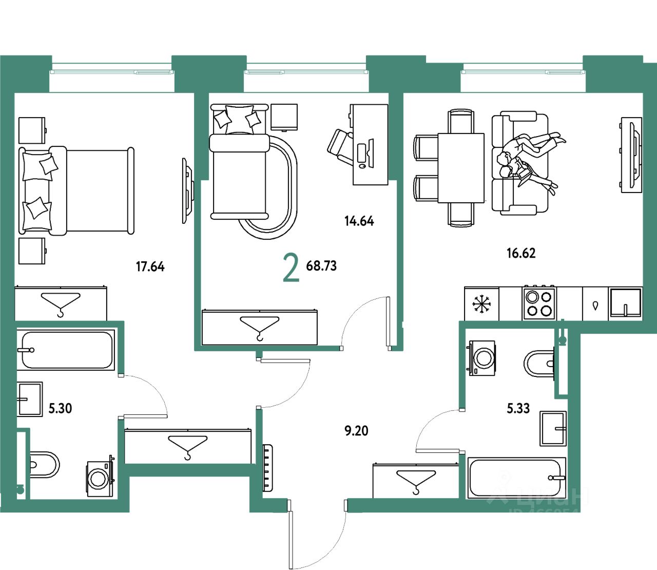 Продаётся 2-комнатная квартира в строящемся доме (Дом 2), срок сдачи: IV-кв. 2027, общей площадью 68.73 кв.м., на 2 этаже. "Страна. Тополёвая" - органично вписанный в городскую среду дом-квартал переменной этажности с акцентной башней доминантой. Мы открываем новую главу истории города, создавая пространство, в котором комфортно жить, работать и строить счастливое будущее.