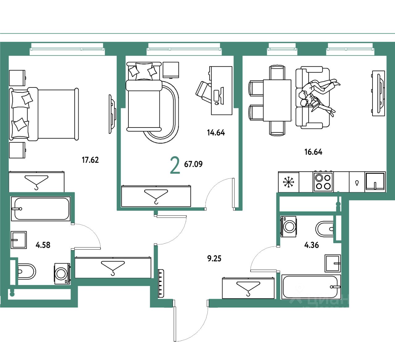 Продаётся 2-комнатная квартира в строящемся доме (Дом 2), срок сдачи: IV-кв. 2027, общей площадью 67.09 кв.м., на 3 этаже. "Страна. Тополёвая" - органично вписанный в городскую среду дом-квартал переменной этажности с акцентной башней доминантой. Мы открываем новую главу истории города, создавая пространство, в котором комфортно жить, работать и строить счастливое будущее.